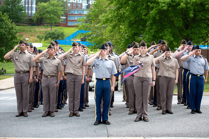 A 75-mm pack howitzer fires daily at 0700 and 1700 from the Scabbard & Blade Triangle (between the Drill Field and Memorial Hall) for the raising and lowering of the U.S. Flag. This 50-year tradition, called Reveille in the morning, prompts cadets to salute and asks civilians to pause and face the flag.