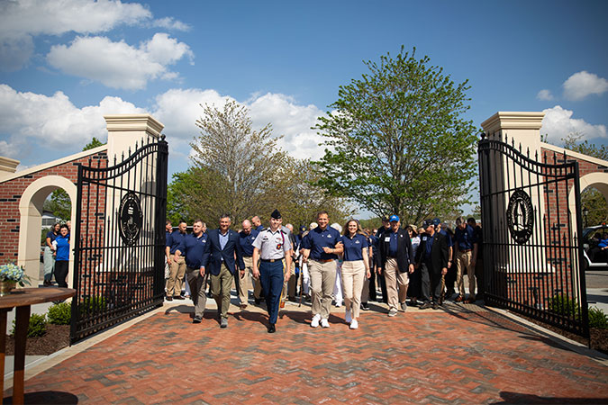 In 2024, a new review stand and gate were added to the south end of the drill field. These enhancements support President Shannon's "Deliver the Corps of the Future" initiative and honor the Corps of Cadets' 1873 legacy of service to the nation. A new tradition has also begun: cadets are not to walk through these gates until they have graduated, except for official ceremonies like marching in groups during Pass & Review.