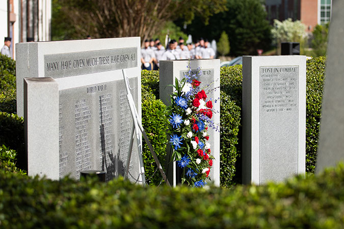 Annually in April, we honor deceased alumni and students by reading their names to consecrate the memorial. Traditionally, those passing through the area pause to pay respects to the fallen before leaving. Find more information about the names listed for remembrance.