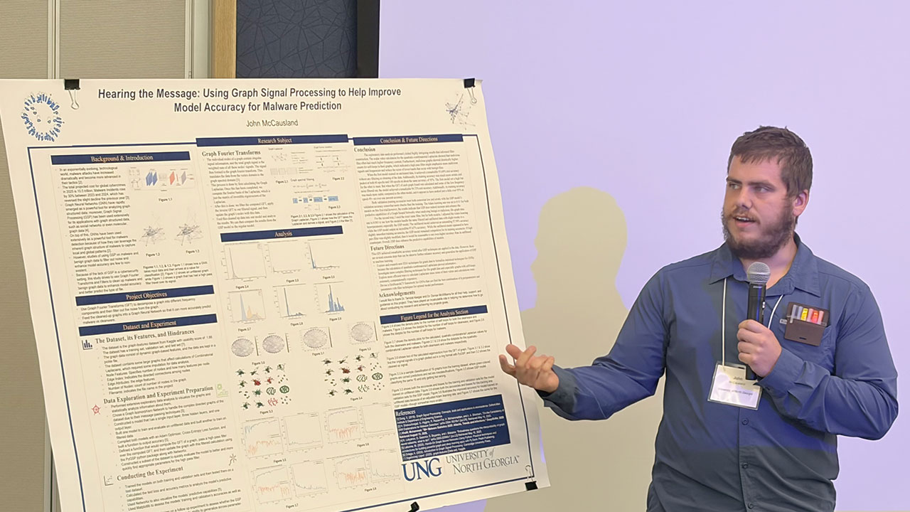 John McCausland, a senior from Cleveland, Georgia, pursuing a degree in computer science with minors in machine learning, data science and statistics, used the symposium as a reason to dive deeper in his machine learning research. His project was "Hearing the message: Using graph signal processing to help improve model accuracy for malware prediction."