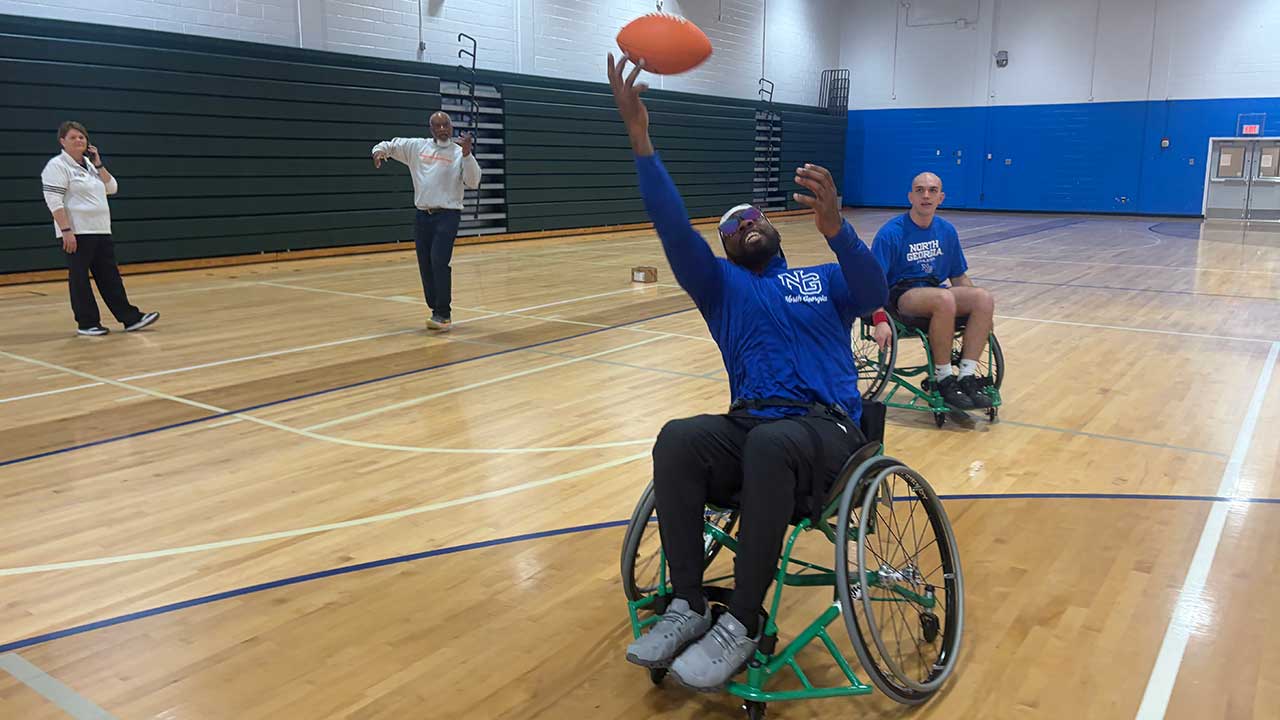On March 23, the Houston County Sharks adapted sports coaches and a leader from the American Association of AdaptED Sports Programs brought their team wheelchairs to allow UNG students to play football and basketball in them. This provided perspective for the future educators on both the challenges some students face and the way they, as future physical education teachers, can make adaptations to serve all students.